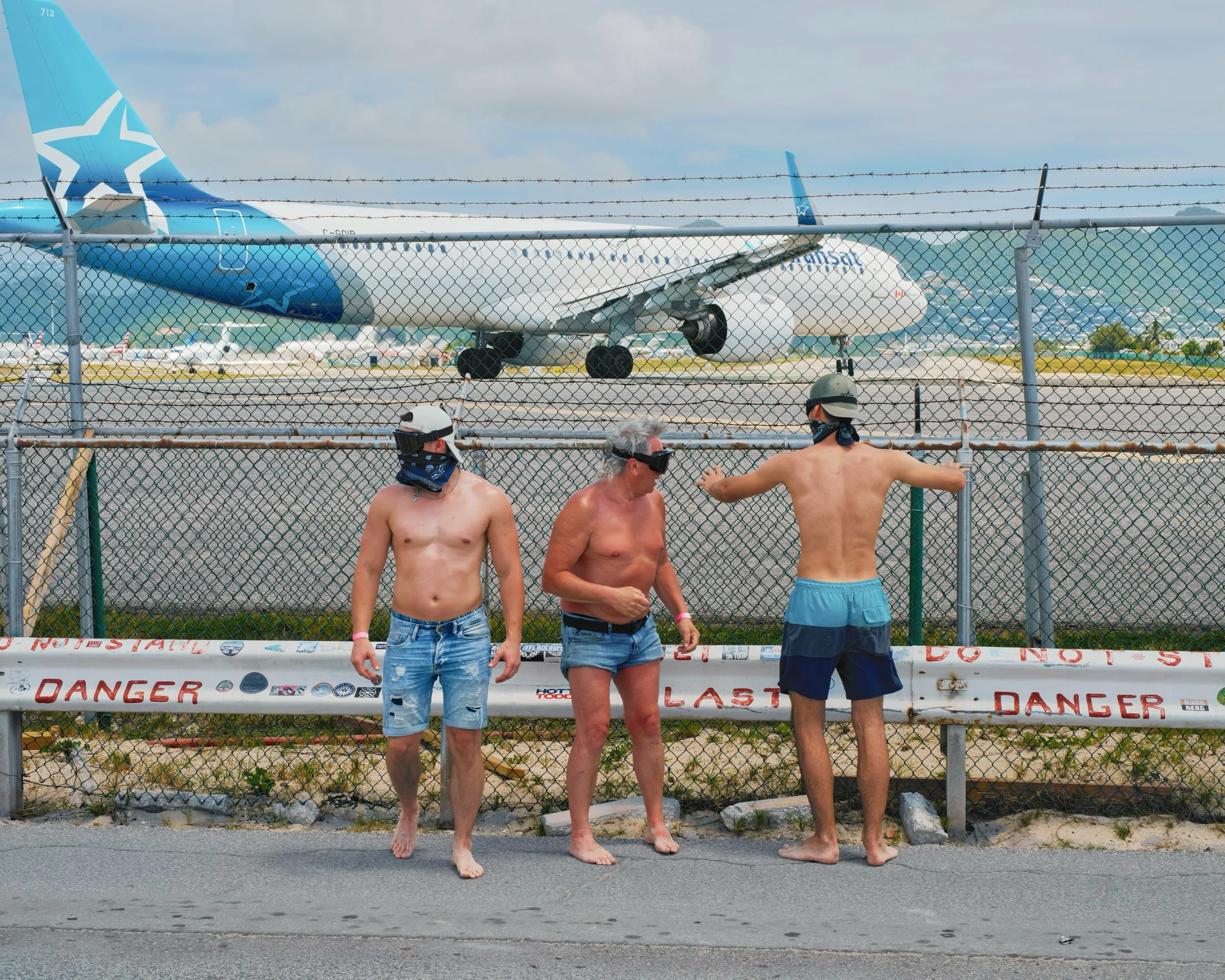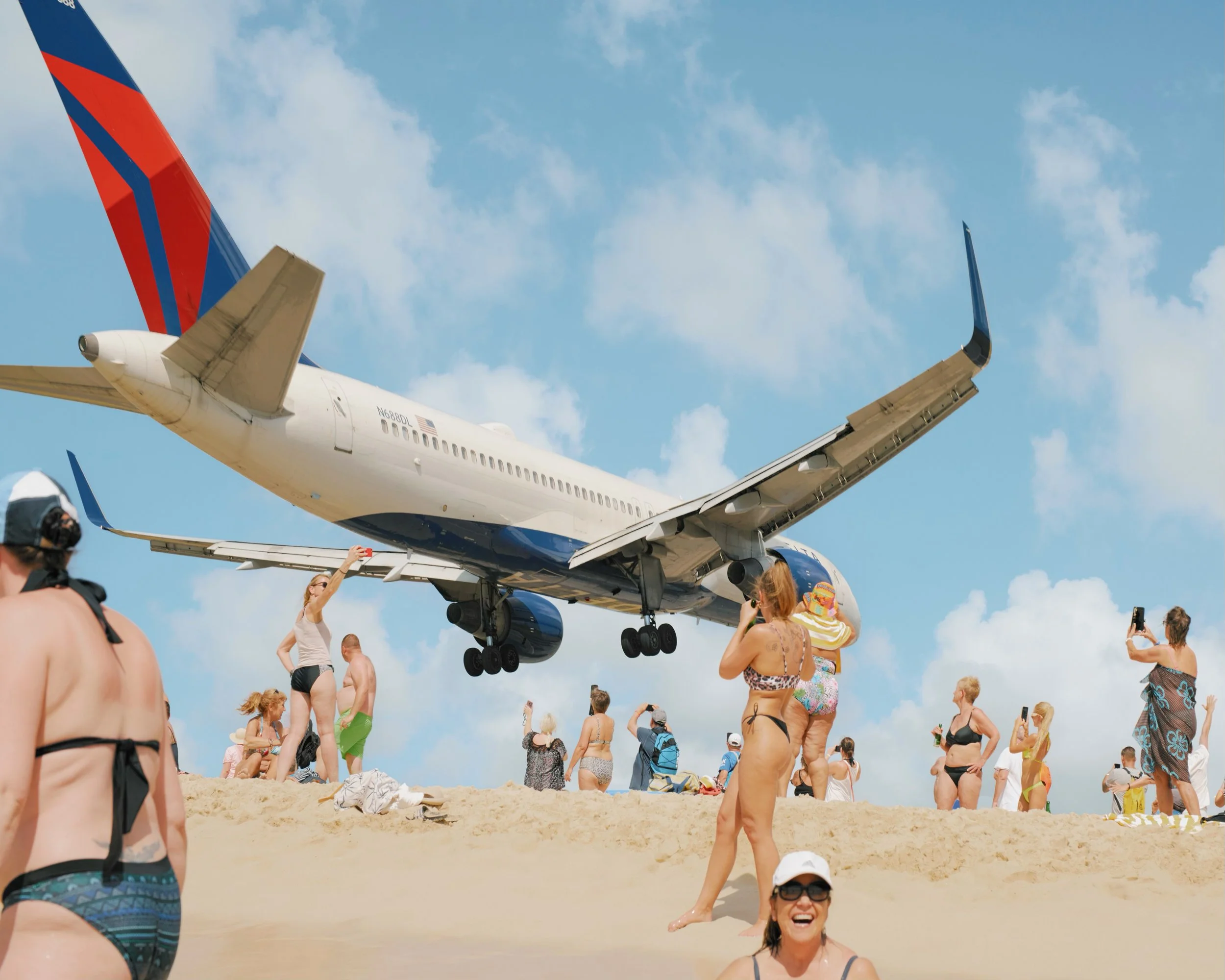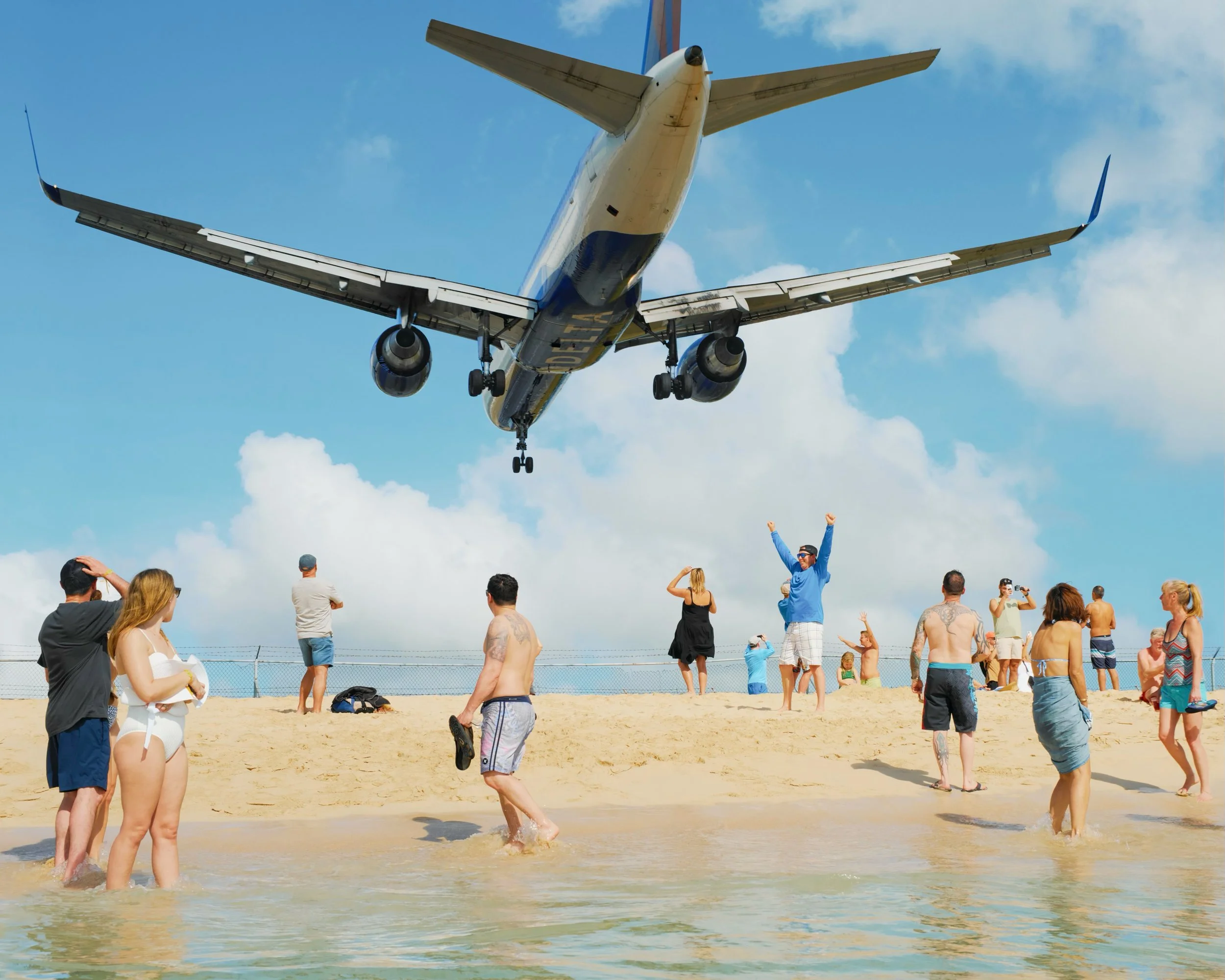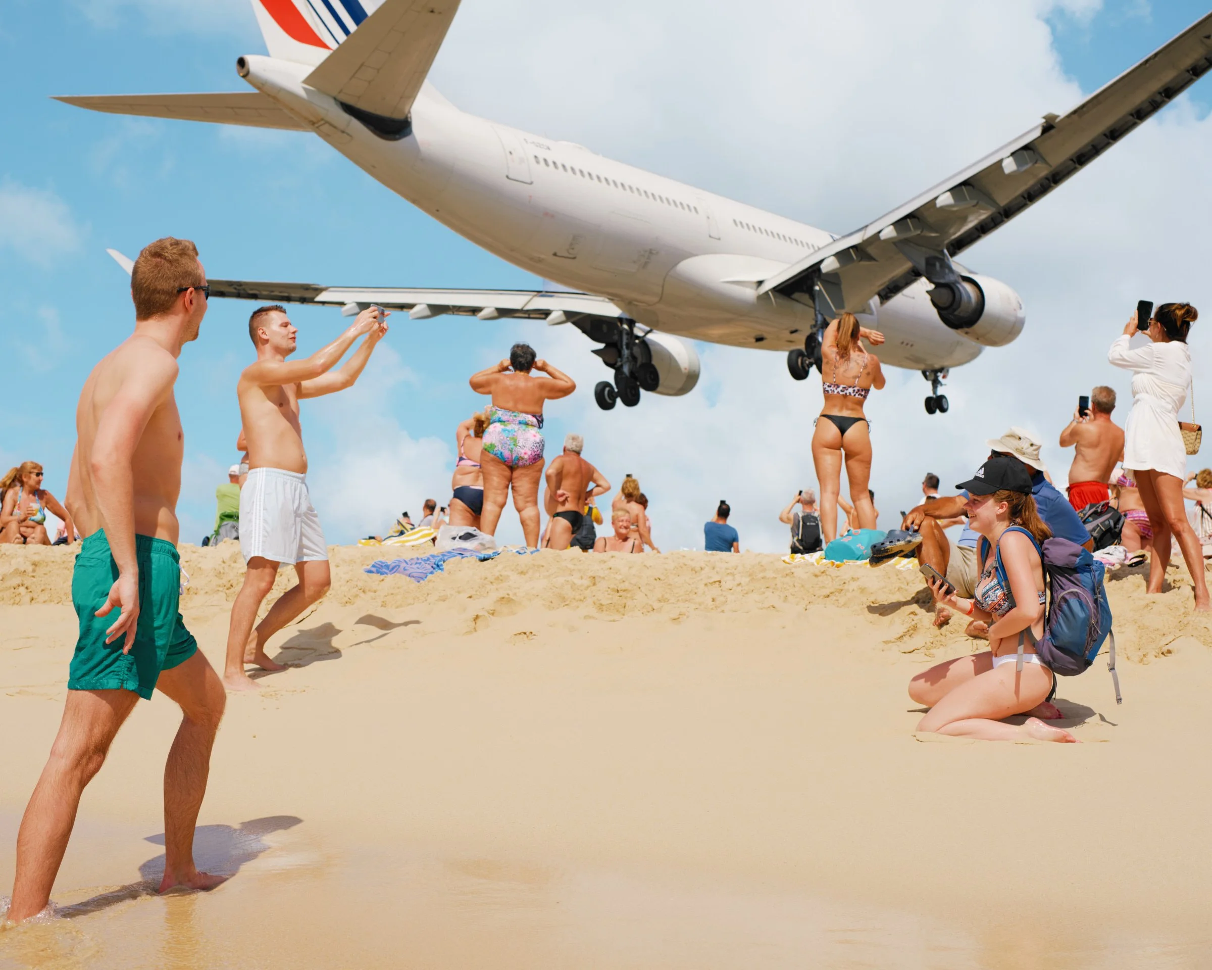 The plane spotters, on the other hand, operate in the real world. They observe, document, and photograph aircraft with great precision. While most stand at a safe distance along runways, a more adventurous scene unfolds at Maho Beach in Saint Martin (Caribbean), where tourists gather in the jet stream of approaching planes. Against a backdrop of turquoise water and azure skies, they feel the thrill of jets skimming just overhead before landing a few hundred metres away — a spectacle that has turned Maho Beach into an iconic holiday destination.