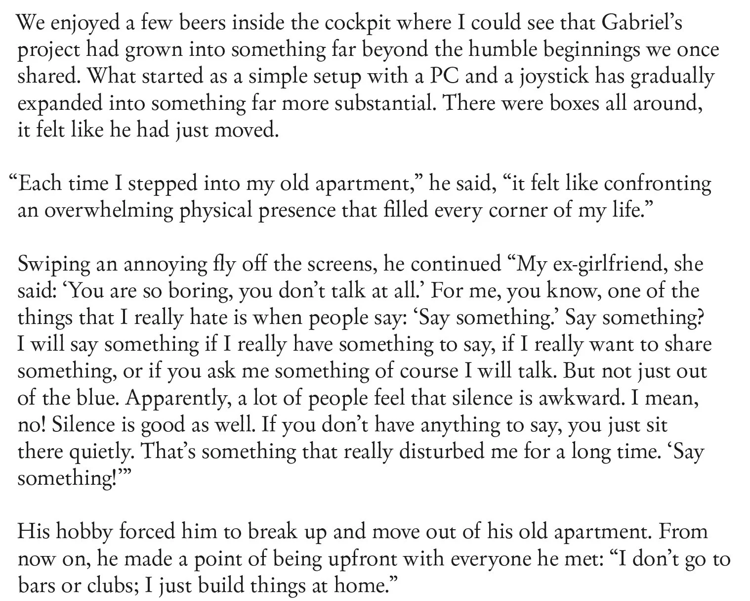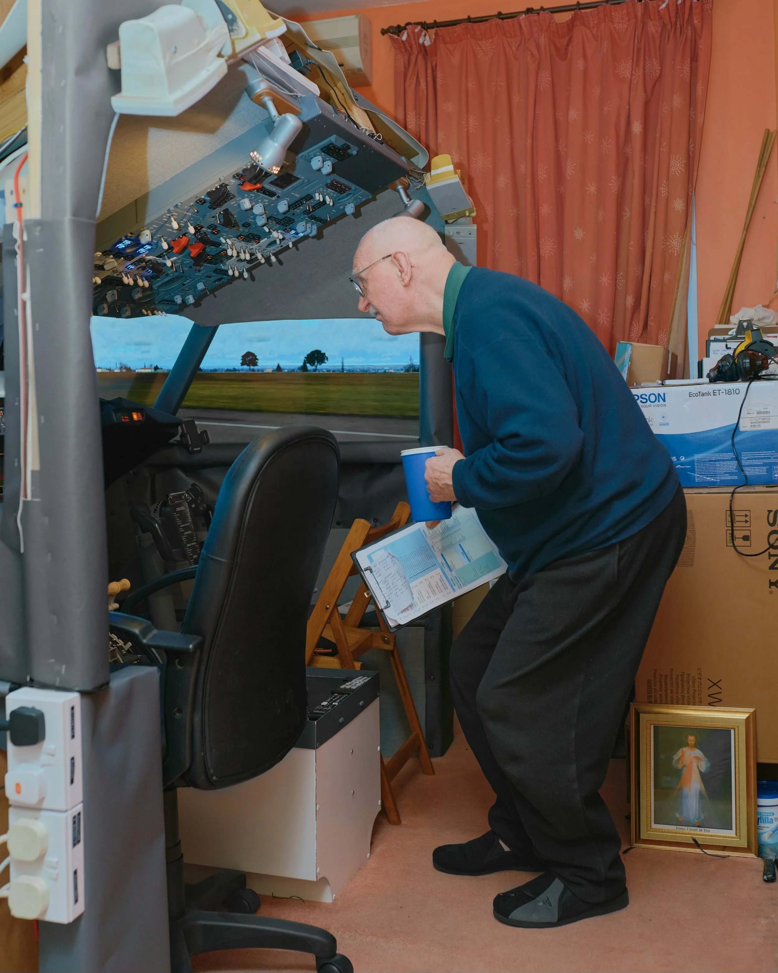Flight simulator pilots are passionate about building cockpits at home. Some mount multiple screens to their desks, while others use actual aircraft parts to create immersive environments. These simulators offer a structured escape from the chaos of everyday life — a world where navigation is often harder. In the cockpit, with its switches and procedures, they find structure, autonomy, and control.